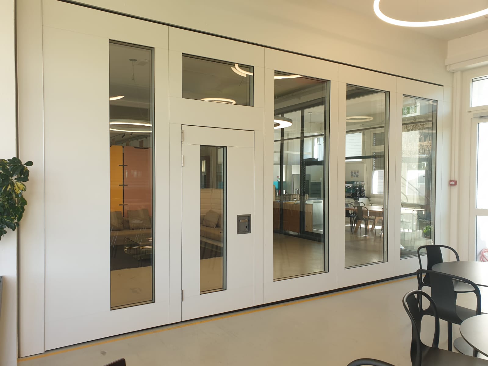 Die mobile Ganzglasanlage moViSTA vereint eine grosszügige Transparenz mit einem hohen Schallschutz. Kombiniert mit Durchgangstüren und Vollwandelementen, ist eine Glasschiebewand immer ein optisches Highlight.